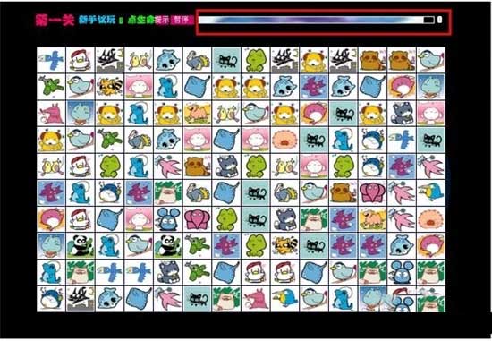 2、点击开始之后,就进入连连看主界面了,在最上方有个时间的横条,在不断的减少,也就是玩游戏的总时间,在这个横条消失之前要把游戏内所有的宠物头像消除干净,消除不完就是失败了。如图: