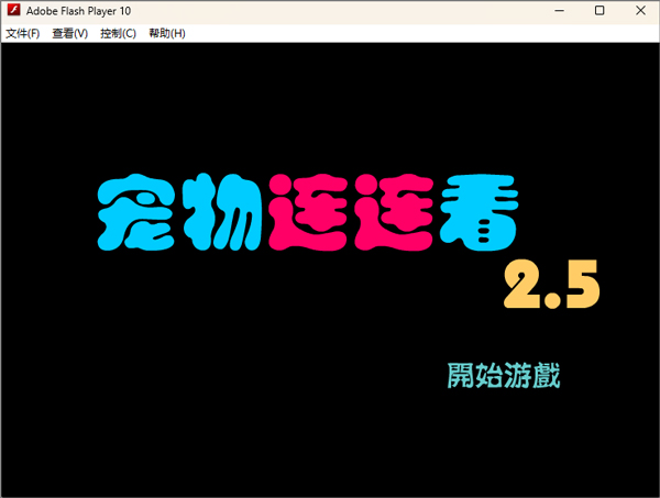 1、首先我们打开游戏,首先我们可以看到这次的宠物连连看画面有些不一样的地方,纯黑的背景,大大的宠物连连看几个字旁边是醒目的2.5,这个游戏的版本就是2.5,下边是开始游戏的繁体字,然后我们点击开始。