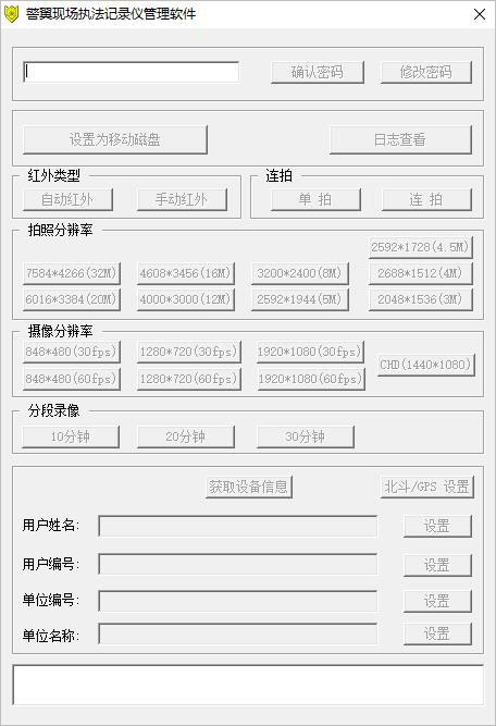 警翼现场执法记录仪管理软件是警翼执法记录仪电脑上的管理客户端,用于对执法记录仪进行信息设置、操作参数设定、文件导出等功能。连接电脑时需要安装驱动后再使用警翼执法记录仪管理软件进行连接,如果其他软件无法识别,可能是版本不对。密码请查看记录仪说明书,可设置红外类型、及连拍模式,设置拍照分辨率和摄像分辨率,设置分段录像时间间隔。