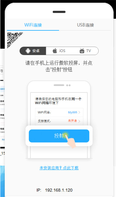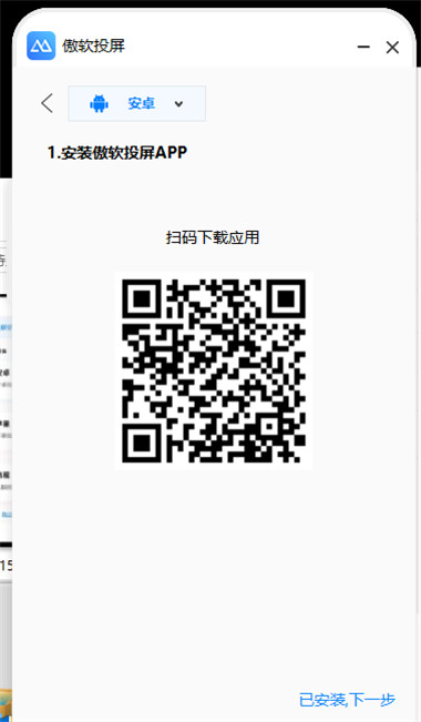 2、点击安卓投屏按钮进入安装投屏软件扫描连接页面,使用厚实APP扫描二维码即可连接软件,