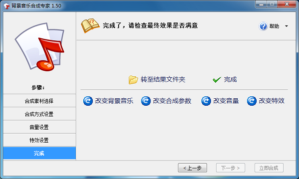 如果并不满意,您可继续进行调整,例如“改变合成参数”、“改变音量”、“改变特效”,甚至“改变背景音乐”