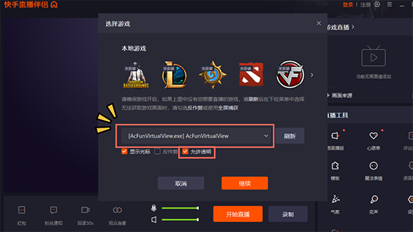 1、需搭配直播伴侣使用,例如AcFun直播伴侣、快手直播伴侣......