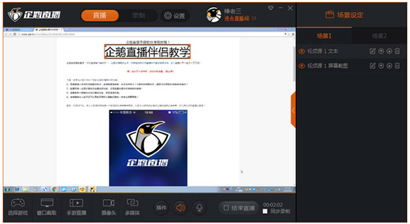 登陆账号后,我们会看企鹅直播伴侣的主界面(见上图),在最下方可以根据个人需求添加直播内容。
