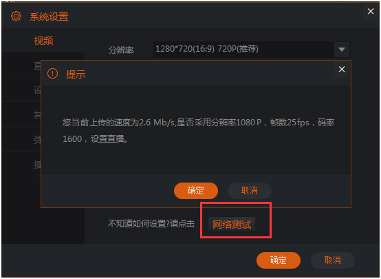 视频设置界面,大家可以调整视频直播的画面,系统默认会有推荐数值,适应多数主播的直播条件,而网络和机器情况良好的主播们,可以自行调整视频参数来适应自己的直播需求。不过就算您不懂参数也没关系,伴侣特别提供系统自动判定功能,您不知道怎么设置?没关系,点击网络测试按钮,伴侣即会检测您的上传速度,来自动调整您网络的最优方案,无需费神,一键搞定。