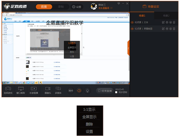 在显示界面右键,可以调节直播内容的大小,点击设置可以更改内容,还可以拖动到合适的位置和拖动改变大小