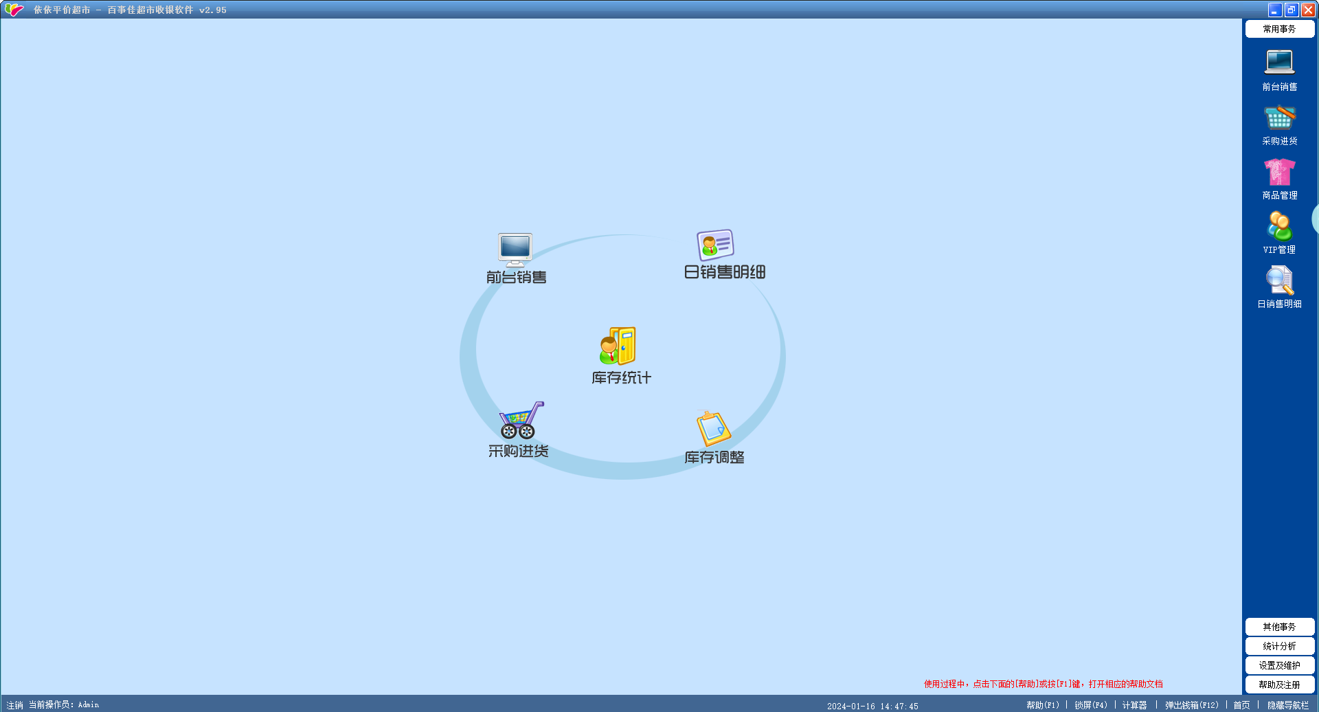 1、常用事务包括了前台销售、采购进货、商品管理、VIP管理、日销售明细。