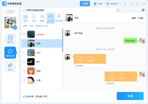 5、能恢复的文件种类多,包括通讯录好友、聊天记录、图片、语音、视频、文件等等。