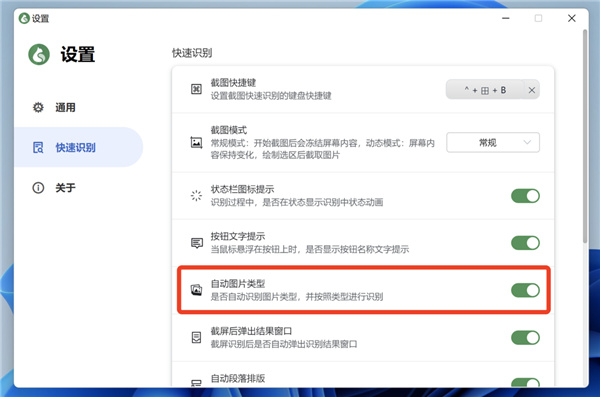 如果你平常截图识别的种类非常多,比如可能需要识别文字、表格、公式、二维码等,可以在设置里打开自动检测图片类型,软件会根据检测到的类型自动进行相应的识别。