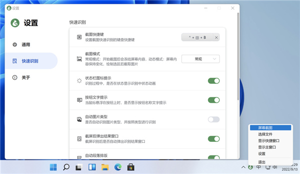 1、截屏 OCR 识别首先,Windows版本最方便的就是截屏识别,软件运行后,会在右下角托盘有个小图标,右键小图标可以有更多操作,比如:截屏识别。
