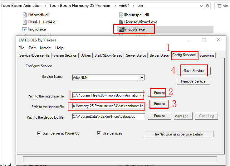 - 确保指向 lmgrd.exe 的路径指向【C:\Program Files (x86)\Toon Boom Animation\Toon Boom Harmony 25 Premium\win64\bin\lmgrd.exe】