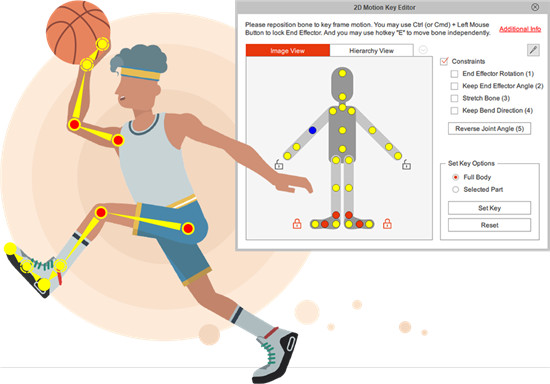 简单实用的设计将Cartoon Animator与其他2D动画工具区分开来。IK / FK系统中的直观2D自动切换,因此动画的角色构成是一个流畅而合乎逻辑的过程。只需锁定角色脚即可获得完美的非滑动脚接触,并锁定角色的手以获得与道具或场景的精确交互。1、轻松IK编辑