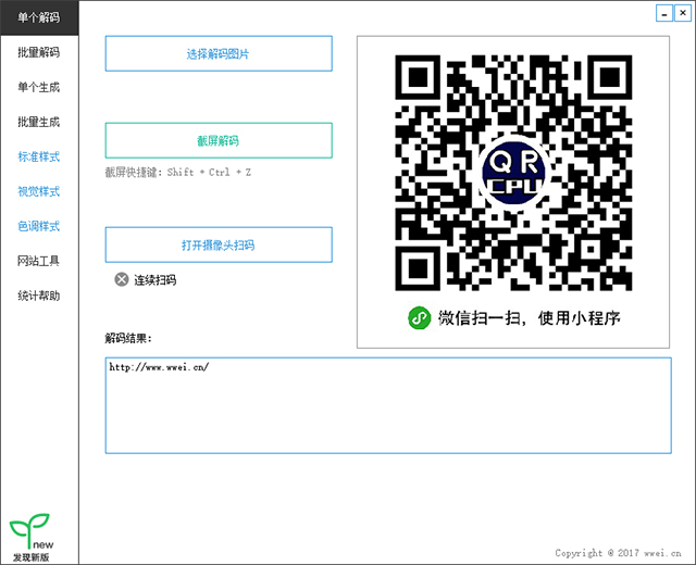 微微二维码官方版是一款方便实用,功能丰富的二维码生成器。集单个解码、批量解码、单个生成、批量生成等多种功能为一体,可加前背景图、圆码眼等,界面简约美观,操作简单方便,拥有超快的解码速度,是一款批量解码二维码、批量生成二维码,二维码行业必备工具。用户只需要输入生成的二维码,然后再去调整对应的参数,便能够快速的制作出符合自己要求的二维码,非常的方便,欢迎有需要的朋友前来下载体验!!!