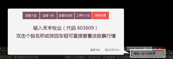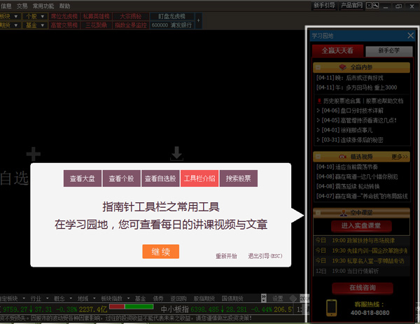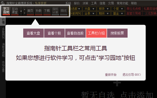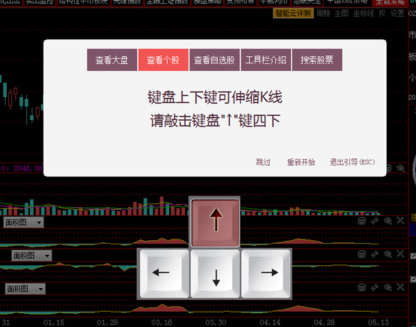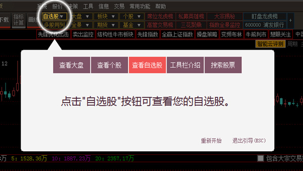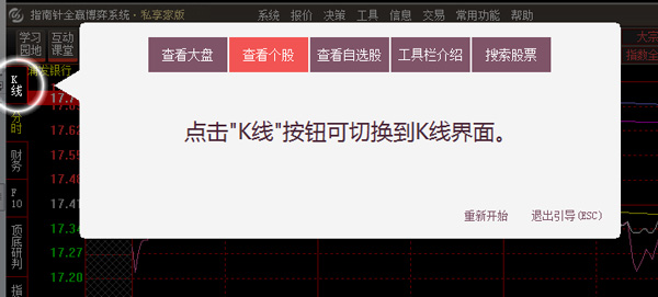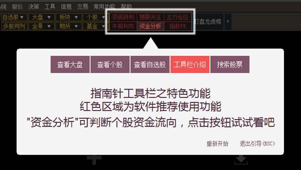 点击“开始新手引导”后,第一步即为“查看大盘”,需要点击“大盘”按钮,进入大盘分时界面,同时引导至下一步。