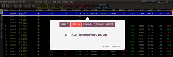 点击“个股”按钮进入行情报价牌界面,用户需要双击选中的股票以进入个股分时界面。