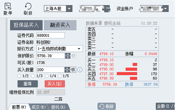 可选择担保品买入、融资买入两种委托方式,通过报价方式选择可支持限价委托以及市价委托策略。