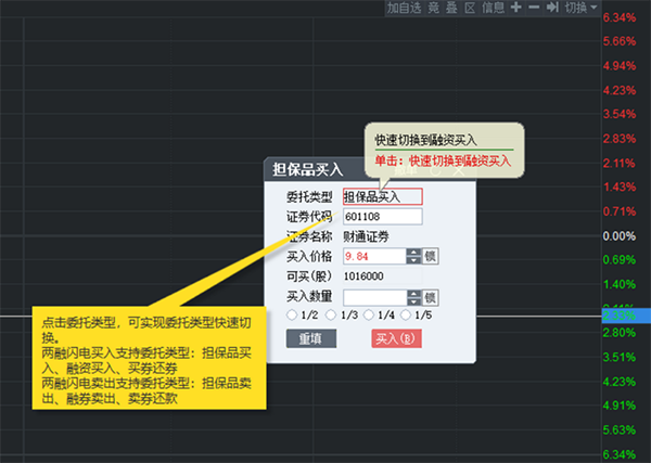 两融闪电买入支持委托类型:担保品买入、融资买入、买券还券