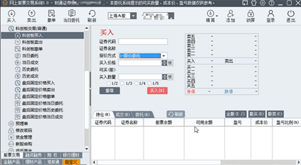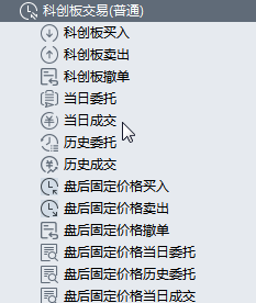 包含科创板买入、科创板卖出、科创板撤单、当日委托、当日成交、历史委托、历史成交、盘后固定价格买入、盘后固定价格卖出、盘后固定价格撤单、盘后固定价格当日委托、盘后固定价格历史委托、盘后固定价格当日成交等委托与查询功能。