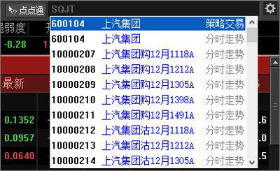 可任意输入标的股票的名称、拼音的首字母或代码,系统会自动显示符合条件的标的股票和其对应的全部期权合约供用户选择,其中的标的股票自动匹配三个选项供用户选择:策略委托、分时走势、详细分析,其中选择策略委托直接进入策略交易系统,分时走势进入该标的股票的走势画面,详细分析直接弹出钱龙证券分析软件或其他主流股票行情客户端;对应的期权全部进入期权的走势画面。