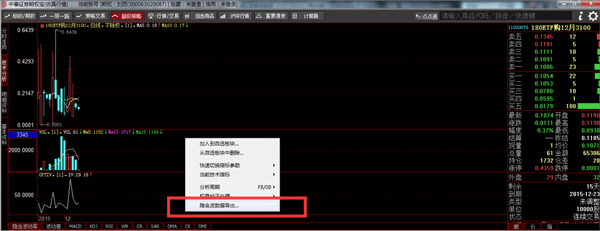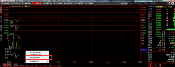 用户在期权合约的分时画面和K线画面均可以通过右键进行隐含波数据的导出,在分时导出隐含波的分时数据,在K线画面导出日数据。