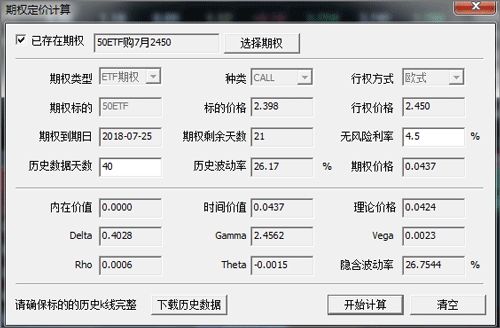 支持对选定合约或自定义参数进行定价计算,可根据每次切片时间计算出该合约的西腊字母、内在价值、时间价值、理论价格、隐含波动率等数值。