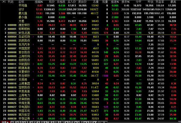 敲数字81、82、83、84、85、86、87,可分别调出上海A、B股,深圳A、B股,沪债、深债,深沪A股的综合排名。系统用9个排成方阵的小窗列出所选市场的股票的涨幅、跌幅、振幅、5分钟涨幅、5分钟跌幅、量比、委比、成交金额排名。