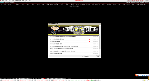 进入系统后,屏幕上首先出现行情显示窗口,列表显示最新股票交易行情。窗口顶部是主菜单条。注意,主菜单条的右端有两组按钮,分别控制系统窗口和其子窗口的最小化、层叠/还原、关闭。该系统支持整屏放大功能,整个界面就像在DOS下一样。