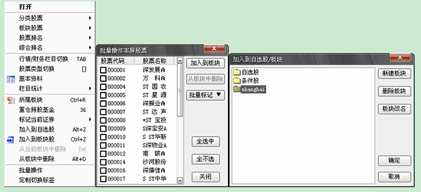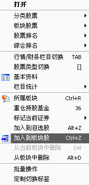 按前面介绍的方法找到需要的股票后,用鼠标右键点击它,从弹出菜单上选择〖加入到自选股〗或〖加入到板块〗,或按Ctrl+Z。删除自选股按ALT+D