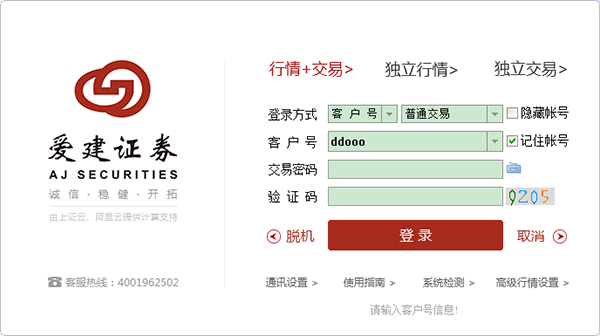 爱建证券超强版是目前网络上最好用的股票交易软件之一,它是由爱建证券官网重磅推出的一款实时证券网上交易软件,支持国密,集行情、交易、资讯为一体,功能强大、操作方便、界面友好。该软件拥有客户号、客户卡号、深A股东、沪A股东、深b股东、沪b股东等多种登录方式,并支持行情+交易、独立行情、独立交易三种运行模式,具备期货行情,实时播报、滚动资讯、市场雷达等特色功能,能够第一时间为投资者提供火爆牛股,让用户快人一步抢得先机,赚得盆满钵满。全新的爱建证券超强版软件功能非常的强大、操作起来也很简单、界面清晰,还具有实时播报、滚动资讯、市场雷达等许多种登陆模式,给用户带来了全新的操作体验,超强版同时还具备的绿色通道功能,可以帮助用户突破火墙的限制。