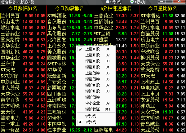 在综合排名中可以使用右键菜单选择查看不同的市场信息,同时可以按“3行3列”或“1行4列”的方式选择查看的方式。