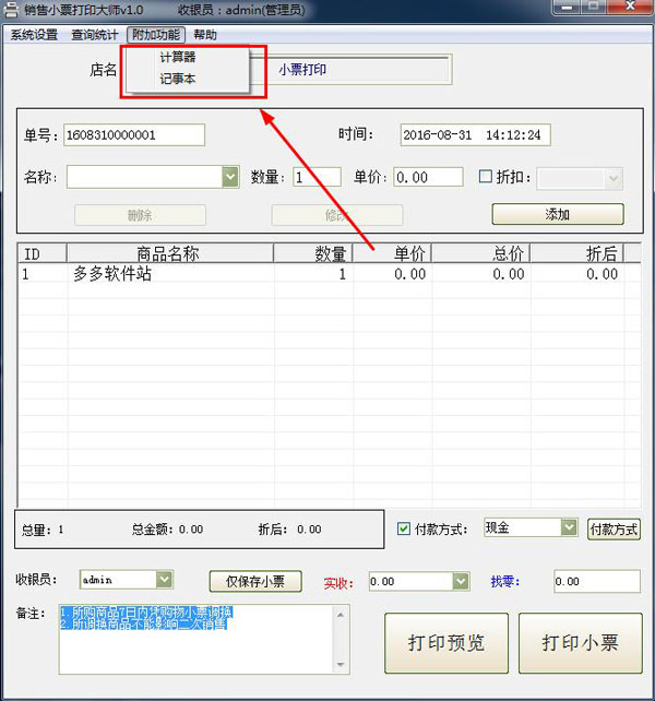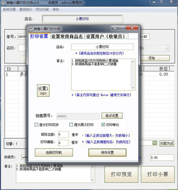 2、软件设置,这里可以设置店名、备注信息、销售票号、选择打印机等