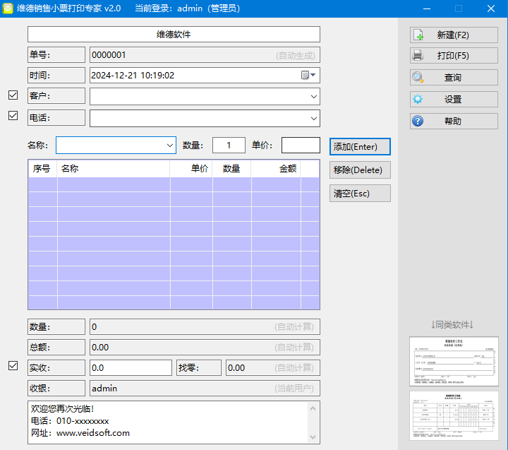 维德销售小票打印专家是维德软件推出的一款可以打印销售小票的软件。操作简单,功能实用,支持字体、边框、纸张自定义,并可以查询统计打印记录,绿色版无需安装,是目前最好用的销售小票打印软件!有兴趣的朋友请下载体验!