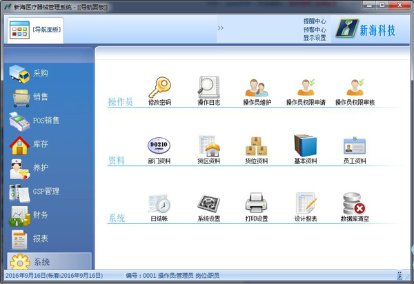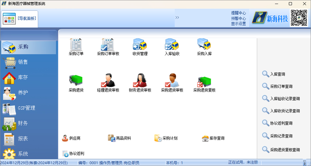 新海医疗器械管理系统是新海科技开发有限公司研发的一款高水准行业软件,专为医疗器械行业提供全方位的管理解决方案,功能全面,操作简单。新海医疗器械管理软件官方版采用商业智能化的控制技术,整合销售,采购,库存,财务管理、GSP管理等环节,使企业管理变得灵活,可调配。另外,新海医疗器械管理系统全面符合新版医疗器械GSP认证要求,帮助医疗器械经营企业顺利通过GSP认证,规范企业管理流程提高管理效率。有需要的朋友欢迎下载使用。