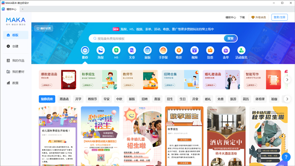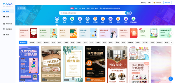 maka h5平台有30000+专业设计师和优质外部开发者提供原创精致的主题模板,10000+优质素材每天实时更新,根据场景需要选择相应的模板进行编辑,海量模板供用户自由选择创作H5。