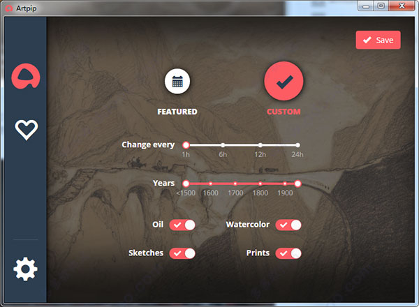 2、Artpip有两种定义模式,一种是「Featured」默认的,另外一种是「custom」自定义。在「custom」中你可以设定壁纸更换的时间间隔、壁纸画作的年代以及画作的类型,最后点右上角的保存按钮即可。