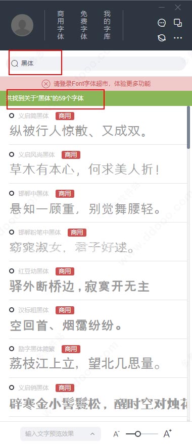 4、想要什么字体,输入即可搜索,如黑体:
