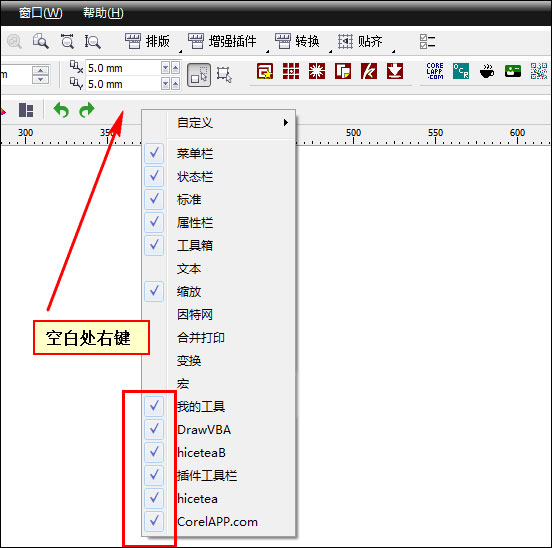 4、如果coreldraw字体管理器插件按钮没有出来,可以在菜单栏下面的空白处右键,然后勾选你安装的插件即可。
