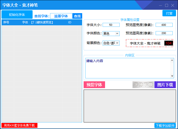 字体大全软件是专为设计师和办工的朋友们提供的一款字体工具,内置小楷字体、太极字体、行书书法字体、王羲之书法字体、包装广告字体、制作印章篆刻字体、广告毛笔字体等四百多套免费字体供用户随意免费下载使用。同时该软件还提供了在线预览功能,只要选择你需要的字体,接着设置下字体大小、颜色、背景色等属性,然后输入内容,点击预览字体即可轻轻松松查看到字体效果图,如果满意即可直接下载字体,或者也能直接将效果图片下载,十分好用。