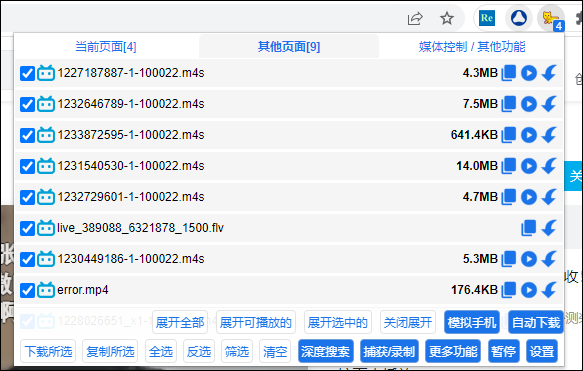 7、猫抓支持优酷、搜狐、腾讯、微博、B站等几乎国内所有网站的视频文件嗅探,在遇到同一页面上出现多个媒体资源时,还能对它们进行快速批量操作;