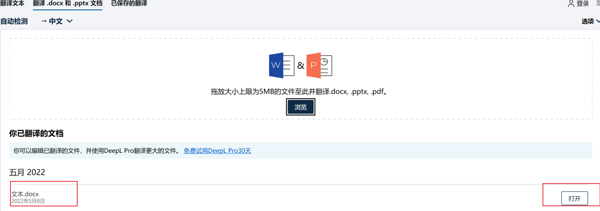 首先,将文件拖放置框内,或点击浏览查找需要翻译的文件,之后选择需要翻译的目的语语种,如译为英文,机器就会开始进行翻译,点击右侧打开后,就可以看到机器翻译的结果。