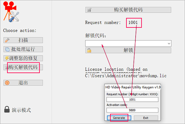 4、选择购买解锁代码,打开kg注册机,将request number复制到注册机,得到解锁代码填入;