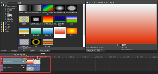 3、然后在【媒体生成器】面板中,找到【色彩渐变】功能,然后选择一款渐变比较明显的效果,将其拖动到软件下方的新建的视频轨道当中去。这里需要注意的是,字幕和渐变色素材要放在两条轨道当中。
