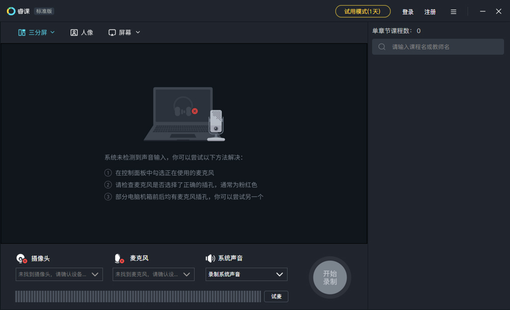 三分屏模式——标准三分屏课件;录屏模式——大视频课件;摄像模式——外接摄像机后可录制全景。