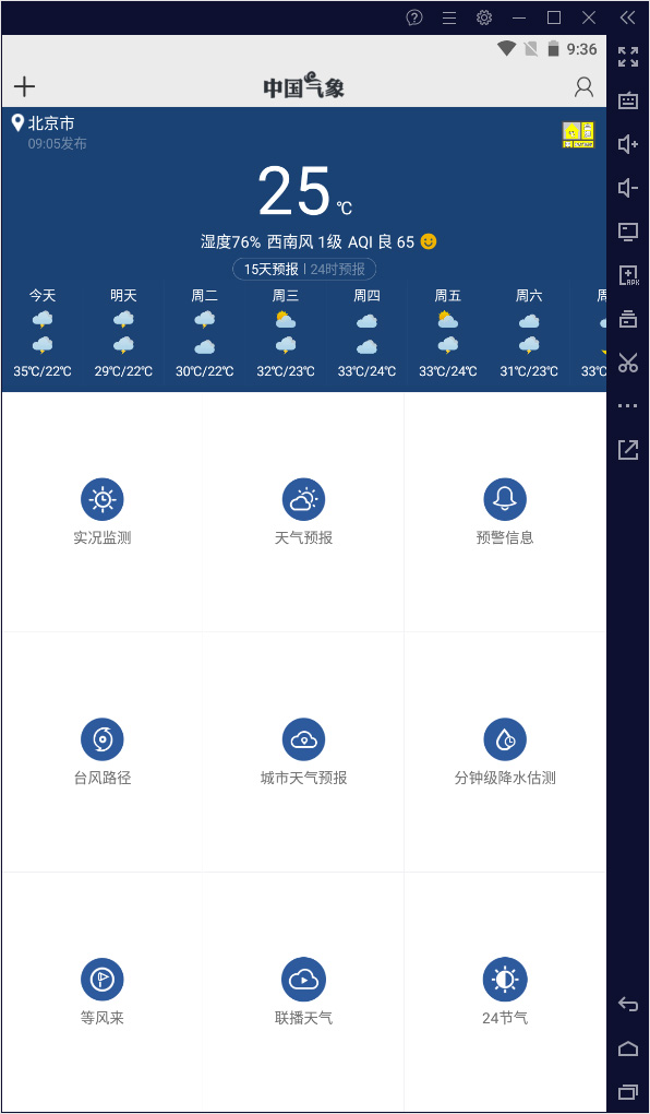 中国气象局app电脑版是借助模拟器运行的一款提供天气预报、天气灾害预警等气象服务的客户端。该软件由中国气象局公共气象服务中心提供权威的气象信息基础上还为用户提供图形化服务,通过电子地图形式展现全国气温、湿度、降水量、空气质量等气象信息对比,是一款集多地区、多功能、多行业的综合性气象软件。