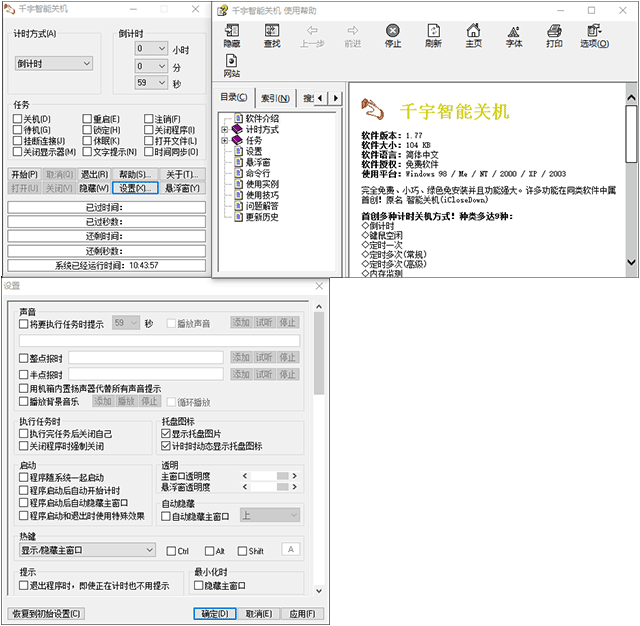 千宇智能关机是目前网络上功能最多,使用最简单的电脑定时关机软件,纯绿色版,即下即用,无广告无插件,支持定时关机、计划任务、cpu监测、内存监测、网络监测等。同时软件可以根据条件启动任务、关闭程序、播放音乐、关闭显示器、电脑锁定等等,非常的给力。有需要的朋友就快来下载使用吧。