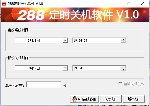 288定时关机软件是一款功能实用的电脑定时关机软件,其能够自动取货当前系统时间,支持自由设定预备关机时间、自动关机生效以及剩余秒数等功能,而且体积小巧,界面简洁,实用方便。另外,288定时关机软件绿色免安装,下载解压后双击启动即可免费使用,有需求的用户欢迎下载体验。