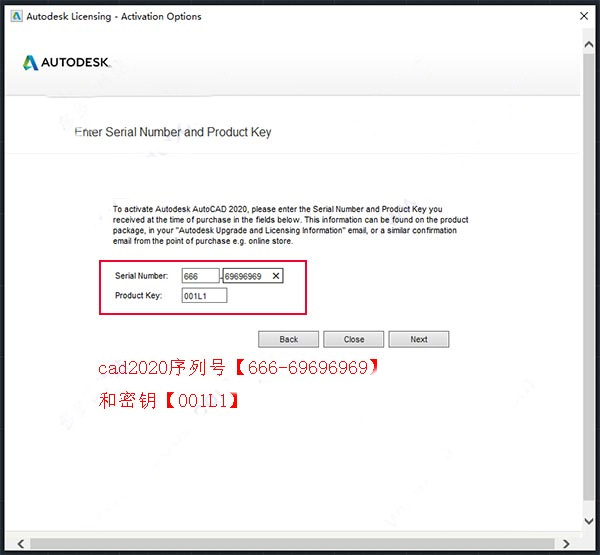 12、输入cad2020序列号【666-69696969】和密钥【001L1】,点击next继续;