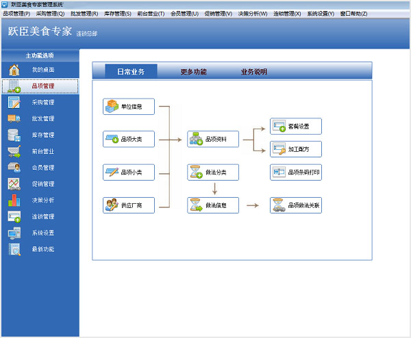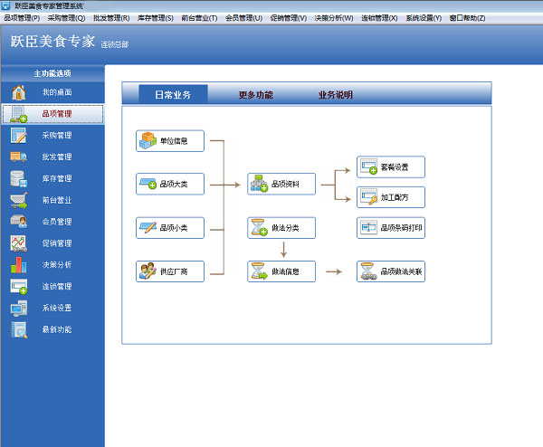 跃臣美食专家连锁版提供完善、科学的连锁餐饮行业的经营管理模式。支持总部、多连锁餐厅(直营店)、加盟店的集团式连锁经营模式。