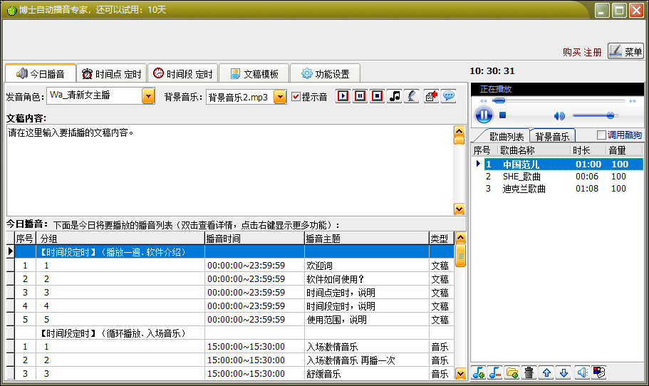 另外,博士自动播音系统还有定时顺序播放多首MP3等功能哟,非常的不错,推荐大家使用!