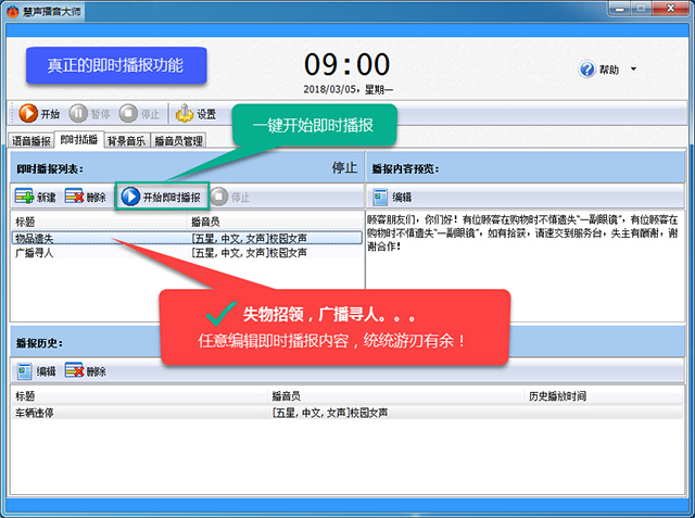2、真正的即时播报功能,失物招领、广播寻人…临时插播游刃有余。