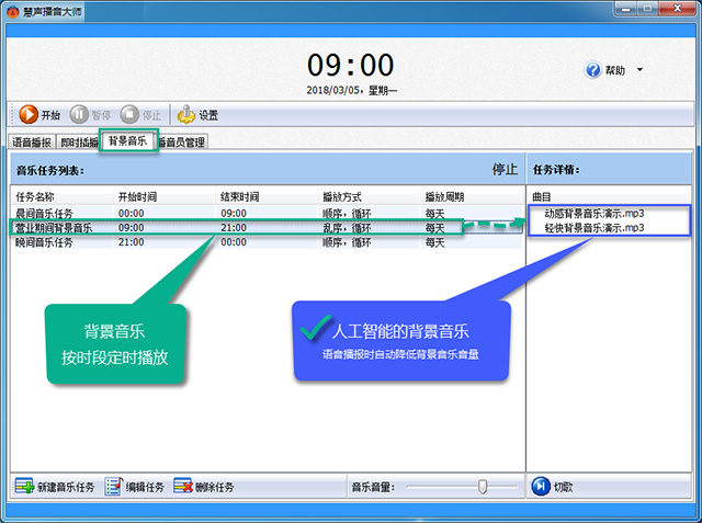 7、可分别设置音乐定时播音节目单和语音的定时播音节目单,且音乐和语音自动匹配,令整个商场音乐不断、气氛不歇
